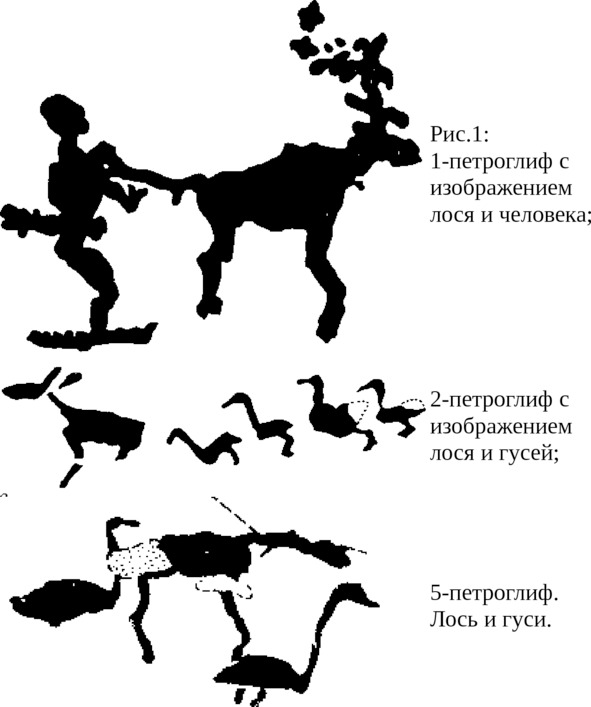 Решая вопрос о том, кто конкретно, лоси или северные олени, изображены на петроглифах Онежского озера, Ю. Савватеев отмечает, что, хотя эти животные и «сильно различаются по облику, величине, образу жизни, но на скалах они показаны в сходной стилистической манере», в результате чего «по одной группе признаков это лось, а по другой – северный олень» Однако «большинство изображений опознается нами как лоси». Ю. Савватеев отмечает антропоморфную фигуру с головой и рогами лося (западная группа так называемая «Бесов нос»), жезлы, имеющие вставки в виде голов лося, и делает вывод, что «все это отражает важную роль образа лося в идеологических представлениях людей». Особенно характерная для петроглифов Белого моря очевидная контаминация образов гуся-лебедя и лося рождает следующий вопрос: если принять в общих чертах гипотезу Д. Раевского о причинах сакрализации водоплавающей птицы, то в чем причины сакрализации образа лося, с которой мы сталкиваемся на неолитических петроглифах Беломорья и Онежского озера? Для хотя бы очень приблизительного ответа на этот вопрос мы должны знать следующее: во-первых, что же это за животное – лось? И, во-вторых, какова была палеоклиматическая ситуация в период V – III тысячелетий до н. э. на территории севера европейской части СССР, т. е. там, где создавались в это время петроглифы с изображениями гусей, лосей, а также оленей.