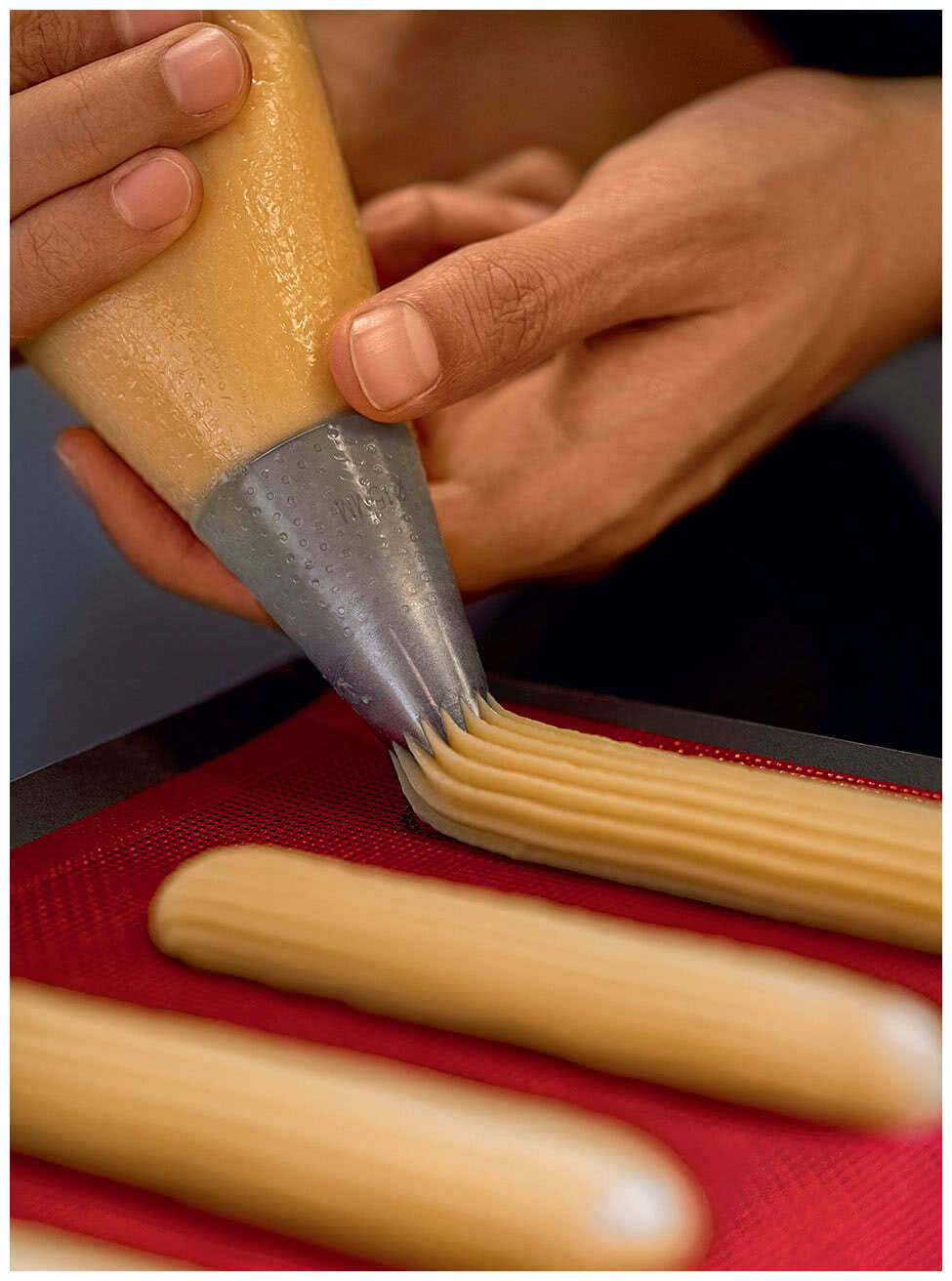 А пока вернемся к вопросу о сложности приготовления теста. Дело в том, что количество яиц, указанное в рецепте, может отличаться от того, сколько используем на самом деле. Ведь мы будем это делать «на глаз» и остановимся, когда тесто приобретет нужную нам консистенцию. И каждый раз количество яиц, которое будет уходить на приготовление теста, может отличаться от предыдущего. Почему это происходит? В первую очередь это зависит от того, сколько влаги выпаривается на первой стадии закипания жидкости. Ведь каждый раз вы перемешиваете жидкость с разной скоростью, готовите тесто в сотейниках разных диаметров и при разной мощности. Все это влияет на выпаривание жидкости в тесте, которое позже мы с вами компенсируем в процессе добавления яиц. То же самое происходит на этапе сушки теста. Также необходимо учитывать, что мука всегда разной влажности и жирность используемого масла не всегда точно 82,5 %. Поэтому каждый раз мы используем разное количество яиц. Сверхважно сконцентрироваться на этом этапе и замесить тесто нужной консистенции.