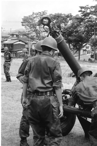 Во второй половине дня я обычно сопровождала подразделения на различного рода полевых учениях (бутай кэнгаку): стрельба из винтовки или прицельная стрельба из минометов (Рис. 2), боевая подготовка, включая стрельбу из пулеметов по войскам, обозначенным как подразделения противника, в лесу, в нескольких милях от базы (сэнта кунрэн).