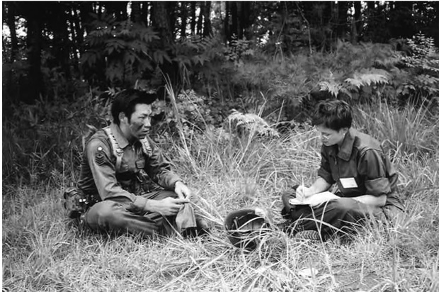 Большую часть времени на базе СССЯ Кибата я брала интервью у двух десятков рядовых, кадетов и сержантов в перерывах между полевыми учениями, что создавало условия для записей поспешных, но в то же время более спонтанных и прямолинейных (Рис. 3). Я создавала ситуацию искусственно, организуя интервью прямо на траве, вне пределов слышимости сослуживцев моих респондентов, при этом полигон был их пространством. Разговор, особенно с сержантами и старшими военнослужащими, протекал так свободно, что я едва успевала записывать. Военнослужащие, которые казались уверенными и довольными своей службой и карьерными перспективами в Силах самообороны, а также высокопоставленные военнослужащие и старше чувствовали себя во время интервью более комфортно. Военнослужащие, которые получали удовольствие от своей работы, чаще шутили по этому поводу, но в то же время смелее отзывались о своем личном опыте и о Силах самообороны как организации критически. Некоторые из рядовых, чьи отцы были ветеранами вооруженных сил, никогда не думали о другой карьере и с очевидным энтузиазмом принимали вызовы полевой подготовки. Сержанты, проведшие жизнь в полевых условиях, обучая многочисленные группы войск, похоже, не беспокоились о заботах тех офицеров, которые отвечали за связи с общественностью и за поддержание боевого духа, организацию самоуправления, имидж Сил самообороны и отчасти за мнение общественности о вооруженных силах. Пот стекал с их лбов, пока я задавала им вопросы о карьере, впечатлениях от новобранцев и о том, как они познакомились со своими женами. Огромные муравьи заползли мне в рукава. Солнечный удар казался неминуемым.