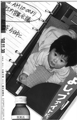 Рис. 4. 30 ноября 1998 года, выпуск еженедельника Aera, полностраничная реклама энергетического напитка «Ripobitan D», использующая боевой клич «Борьба!», обращенный к военному как профессионалу, и образ малыша, обращенный к военному как отцу семейства. © University of California Press/The Regents of the University of California. January 2021. Academic Studies Press