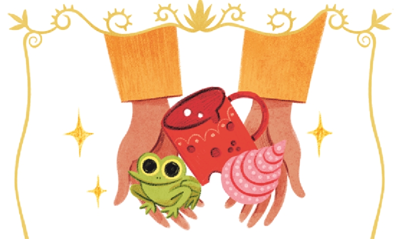 Лягушка. Девочка посадила её на карточный домик, но та сразу спрыгнула и ускакала как можно дальше с громким «КВА!».