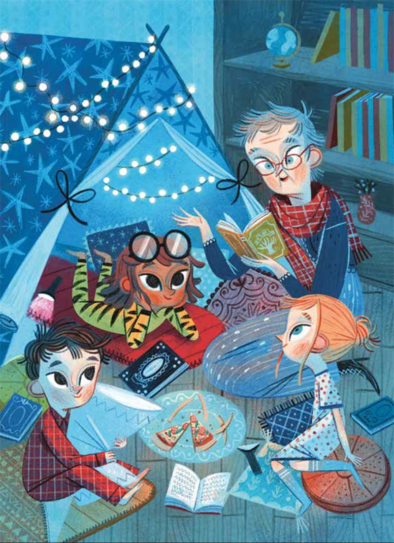 В эту ночь Зои осталась ночевать у своих друзей. Их пижамные вечеринки всегда проходили лучше некуда. Они ставили палатку и раскладывали спальные мешки прямо в комнате Лукаса и Марины. Дедуля Тельмо готовил пиццу, а бабуля Амелия рассказывала истории.
