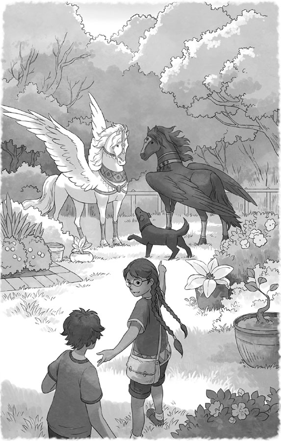 Друзья близнецов – кони-пакхираджи – стояли в дальнем углу двора под деревьями, которые папа-садовник посадил в прошлом году. Деревья хоть немного скрывали пакхираджей. Страшно подумать, что сказали бы соседи, увидев во дворе Раджкумаров двух гигантских крылатых коней – чёрного и белого.