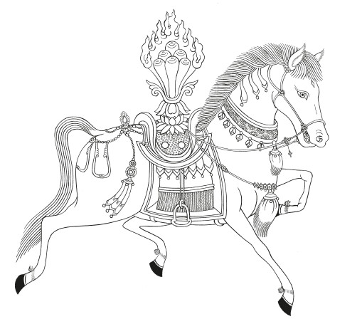 Царь Ригденов выглядит гневным, но его доспехи – всегда золотые, символизирующие сострадание. Его меч представляет пронзающую мудрость, которая видит изначальное добро. Вымпелы на его шлеме символизируют отвагу пробуждать в других коня ветров – долгую жизнь, прекрасное здоровье, успех и счастье. После победы Ригденов, как гласит история, наступает эпоха Просветления. Солнце Великого Востока восходит на горизонте.