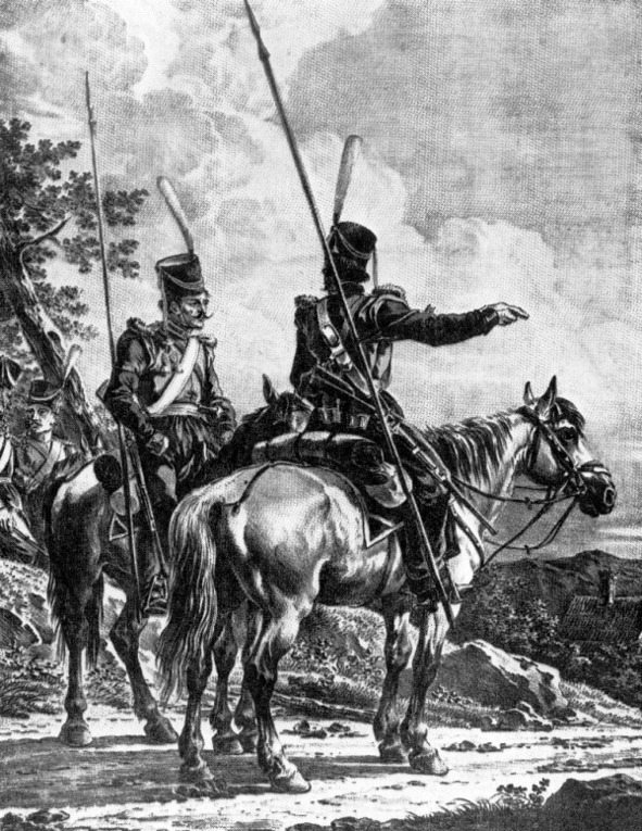 «Стычка казаков с французами у с. Довгелишки 23 июня 1812 года». Раскраш. гравюра XIX в.