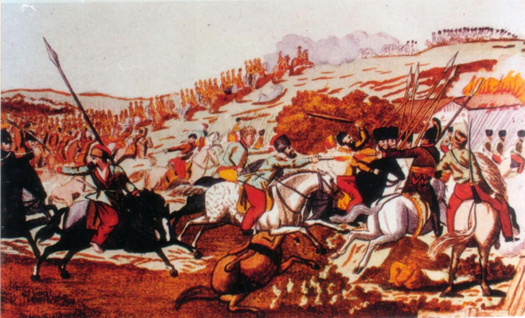 Башкир-тептяр с переднего плана гравюры выстрелом из пистолета убивает своего преследователя и смело бросается в сабельную рубку с другими. Первая атака отбита. В 18 часов неприятель открывает артиллерийский огонь и возобновляет наступление. Но русская артиллерия под началом Кутайсова останавливает их продвижение. В это время генерал Орлов – Денисов во главе лейб-гвардии Казачьего, 1-го Тептярского, 1-го Бугского казачьих и Елисаветградского гусарского полков при поддержке нашей артиллерии атакует неприятеля и заставляет его в беспорядке отступить.