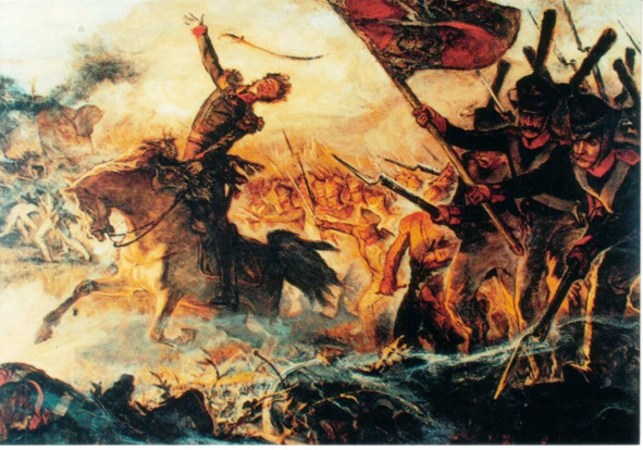 Барклай, в генеральском мундире и треуголке с черным пером, угрюмый, затравленный насмешками, сплетнями, подозрениями в измене, словно ищущий смерти, весь день под огнём, лично командует корпусом. Под ним убили коня. Польские уланы Понятовского, увидев поверженного генерала, устремляются к нему, чтобы взять в плен, выслужиться, получить награду за такую добычу, но адъютант, ординарец и подоспевшие гусары изрубили поляков вчистую – никто не улизнул.