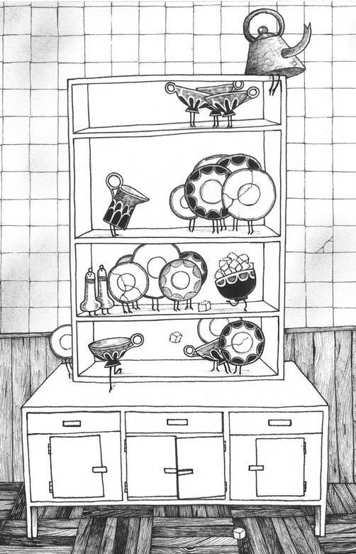 Кухня находилась в цокольном этаже дома. В старой печи тлели угольки, на металлических крючках висели сковородки, а в крашеном буфете располагались сварливые предметы посуды: чашки и тарелки, как всегда, спорили, кому где стоять.