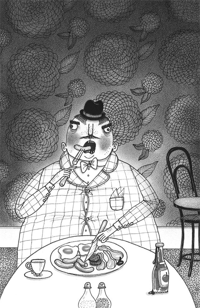 Тем же солнечным утром, в тот же самый час Бельмар Глочепут, единственный постоялец гостиницы «Русалка», уплетал в столовой завтрак: яичницу из двух яиц, три ломтика бекона, четыре сосиски, четыре куска кровяной колбасы, шесть жареных помидоров в кляре, семь картофельных оладий, десять маринованных грибочков и горку масленых тостов из белого хлеба.