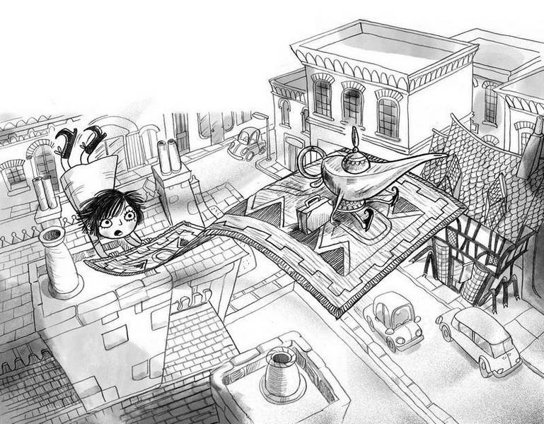 Раздался свист воздуха, и ковёр вместе с Эмили начал медленно подниматься. Пончик отчаянно залаял. Эмили не успела опомниться, как ковёр взмыл вверх и она упала на него животом – и слава богу, поскольку они уже летели над крышами домов. Но Эмили всё больше сползала, пока наконец её ноги не повисли воздухе. Изо всех сил она вцепилась руками в край ковра.