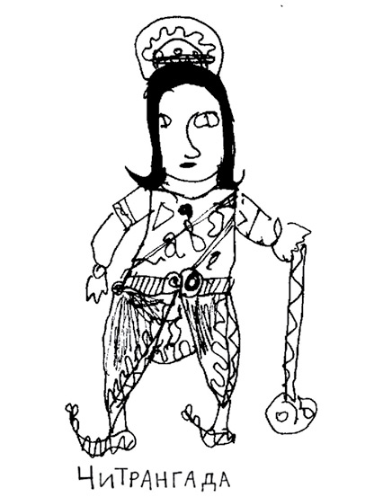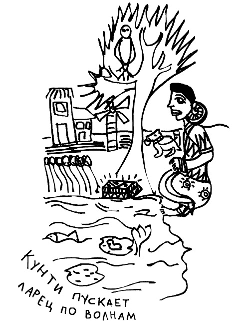 Тут он заключил ее в объятия. От этого союза родился ребенок, облаченный в золотой доспех, а в ушах у него были золотые серьги. Опасаясь, что это ее опозорит, Кунти положила ребенка в резной деревянный ларец и пустила по реке. Стала Кунти царевной грустной – она знала, что проступок этот ей не простят никогда. Взгляд ее сделался навеки печален.