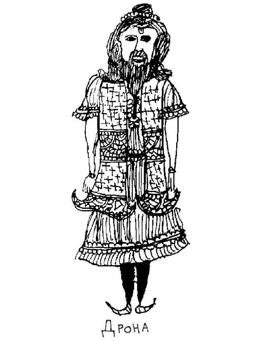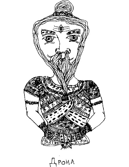 Однажды, чтобы проверить меткость своих учеников, Дрона поместил на высокую ветку деревянную птицу. Позвал учеников и велел им целиться той птице в голову.