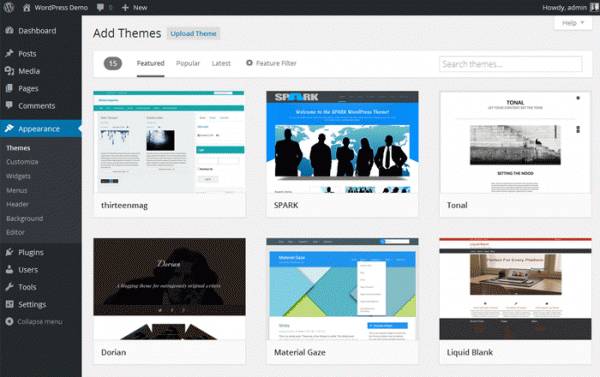 Чтобы добавить темы из каталога, вам не обязательно даже посещать официальный сайт WordPress. Вы можете установить темы через консоль WordPress. Посетите раздел «Appearance» – «Themes» – «Add New», и вы увидите список тем. Здесь вы можете выбрать самые свежие темы, популярные темы, а также просто интересные темы (которые меняются случайным образом каждый день). Также имеется фильтр, который позволяет вам выбирать темы по цветовой гамме, возможностям и опциям макета. Вы можете выполнять поиск по ключевым словам, которые будут описывать необходимый вам тип темы.