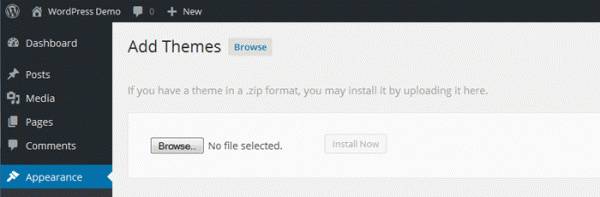 Более простой способ установки темы – загрузить ее в zip-формате через консоль. Чтобы сделать это, перейдите в раздел «Appearance» – «Themes» – «Add New» – «Upload Theme», щелкните по кнопке «Browse» и выберите zip-архив с темой на вашем компьютере, после чего щелкните по кнопке «Install Now».
