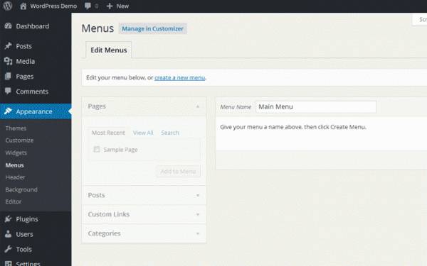 Заключительная возможность, связанная с темами, которую мы рассмотрим – это возможность добавления меню. Она позволяет вам создавать меню для вашего WordPress-сайта. Каждая тема имеет разные места, отведенные под меню, и с помощью данной возможности вы можете добавлять произвольные пункты в меню. Чтобы получить доступ к этой возможности, перейдите к разделу «Appearance» – «Menus» (вы можете также получить доступ к меню через кастомайзер, если вы хотите просматривать изменения в реальном времени).