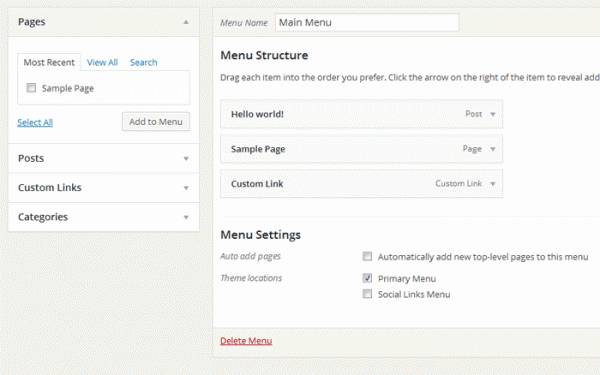 Теперь вы можете добавлять ссылки в ваше меню, используя опции с левой стороны. Вы можете добавлять любые страницы с вашего сайта, любые записи, любые рубрики, вы можете создавать произвольные ссылки, указывающие на любой URL-адрес. Вы можете также переименовывать ссылки, менять порядок пунктов с помощью перетаскивания, пока вы не получите меню, которое вас полностью устраивает. В области «Menu Settings» вы можете видеть опции с названиями меню. Это – доступные области меню, которые предложены в вашей теме. Они могут быть разными в зависимости от темы. Выберите локацию и щелкните «Save Menu», после чего меню появится на вашем сайте.