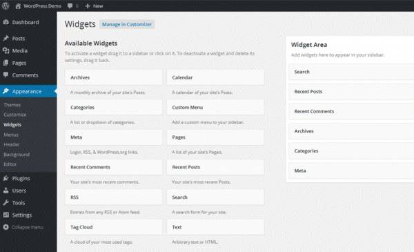 Мы переходим к рассмотрению виджетов. Виджеты – это способ добавления разных фрагментов контента к вашей теме в сайдбары, футер, а также в любые другие «виджетизированные» области, которые предлагает ваша тема. Каждая тема может предлагать разные виджетизированные области, однако большинство тем включают в себя сайдбар. Виджеты доступны на странице «Appearance» – «Widgets», где вы можете видеть список доступных виджетов с левой стороны экрана и ваши области с правой стороны. Чтобы добавить виджет на ваш сайт, просто перетащите требуемый виджет в выбранную область.