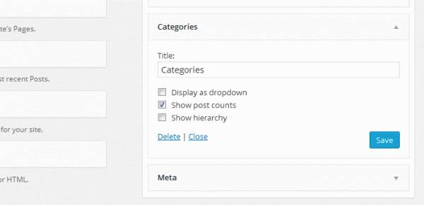 Как только виджет окажется в нужном месте с правой стороны экрана, вы можете щелкнуть по нему, чтобы открыть его. Вы увидите, что каждый виджет имеет свои собственные настройки, которые вы можете задать. К примеру, виджет «Categories» будет выводить список рубрик на вашем сайте. Вы можете дать ему название, выбрать вывод в виде раскрывающегося списка, задать вывод количества записей для каждой рубрики, а также определить вывод иерархии (если у вас имеются вложенные рубрики).
