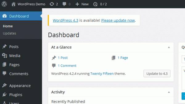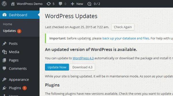 По той же самой причине вы должны всегда поддерживать в актуальном виде все свои плагины и темы. Дыры могут быть найдены и в них. Процесс их обновления аналогичен – все доступные обновления будут выводиться в разделе «Dashboard» – «Updates». Количество доступных обновлений будет выводиться в виде красного кружочка с цифрой.