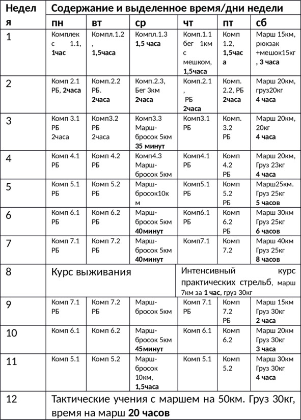 Сокращения таблице: комп. – комплекс упражнений; РБ – рукопашный бой.