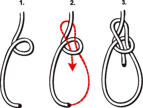 Узел проводника (проводник, рисунок 27) – простой узел, завязываемый сдвоенным концом верёвки. Применяют для привязывания поясницы альпиниста к середине верёвки в связке, как тормозящий узел, в качестве стопорного узла на конце верёвки. Узел прост. После нагрузки трудно развязать (особенно на мокрой верёвке). При завязывании на конце верёвки – необходим контрольный узел.
