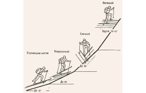 В зависимости от крутизны и протяжённости склона, подъём производится ступающим шагом, полуёлочкой, ёлочкой, лесенкой и зигзагом (рисунок 42).