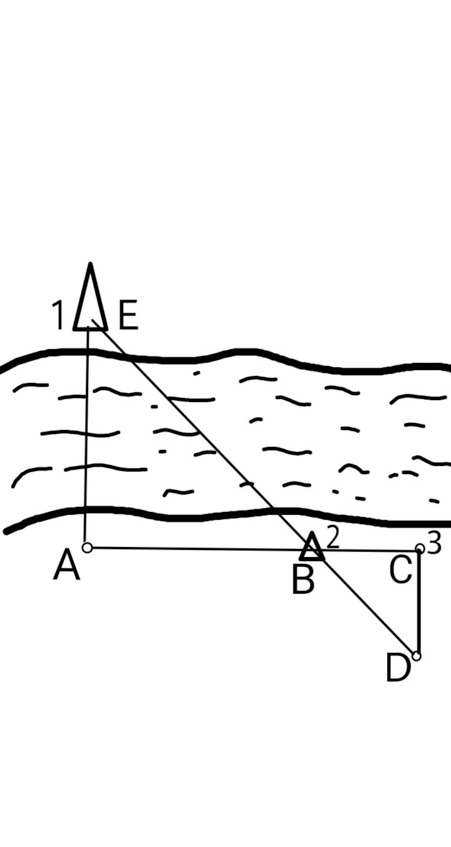 Измерение методом подобных треугольников (рисунок 44) производится следующим образом. Необходимо встать на своём берегу (А, рис. 44), напротив какого-либо отчётливо наблюдаемого предмета на противоположном берегу (дерево, большой валун, отдельный куст, Е, 1 на рисунке), затем от точки своего стояния отмерить вдоль берега какое-либо расстояние (например, 60 шагов) и поставить в этой точке веху (В, 2).