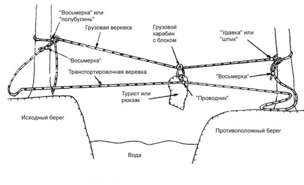 В верхнюю петлю защёлкиваются два карабина, в нижнюю – один. Схватывающий узел либо зажим натягивающей петли по мере натяжения верёвки одним из участников продвигается в направлении реки. После достижения необходимой натяжки, грузовая верёвка заводится вокруг опоры. На ней вяжется «восьмёрка» с деревянным вкладышем, и в петлю узла защёлкивается карабин. Делается это для того, чтобы заведя конец верёвки за опору и обогнув её, пристегнуть карабин к грузовой верёвке. В этот же карабин защёлкивается и конец транспортировочной верёвки – для того, чтобы потом с противоположного берега можно было бы снять грузовую верёвку. После этого полиспаст снимают, предварительно натянув его и сняв удерживающий зажим (либо схватывающий узел).