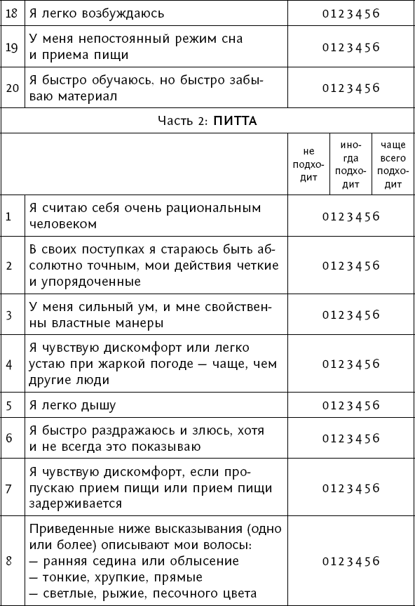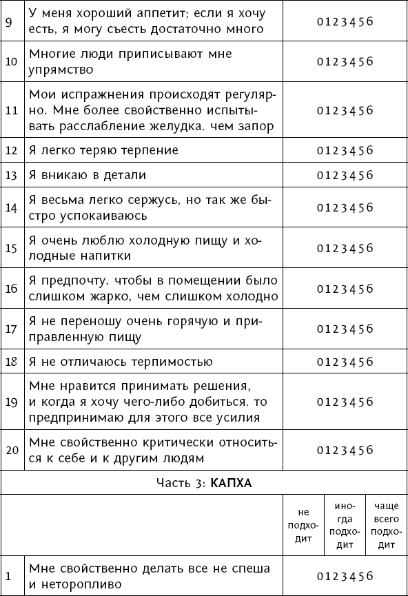 Приведенная далее анкета разделена на три части. Отвечая на первые 20 вопросов, относящиеся к доше вата, внимательно прочитайте каждое утверждение и поставьте цифру от 1 до 6, ориентируясь на то, что вам больше подходит.