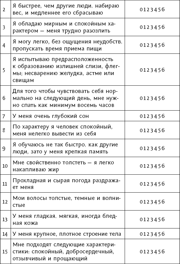 Прежде чем продолжить, давайте разберемся, какая доша (или какие две доши) доминирует в вашей конституции. Людей, находящихся под влиянием только одной доши, очень немного, и у большинства есть основная доша, а также вторая, менее сильная. Полностью сбалансированная конституция, где все три доши находятся в полном равновесии, – совсем большая редкость.