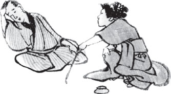 Когда настало утро, господин Иидзима вернулся домой. Время было жаркое, и О-Куни, расположившись возле него, словно приношение на алтаре, принялась обмахивать его веером.