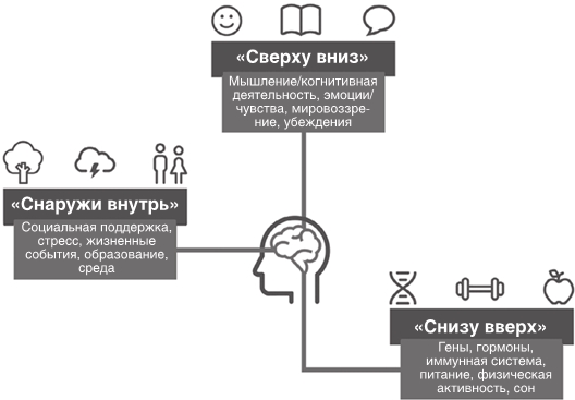 Модель «снизу вверх, снаружи внутрь, сверху вниз» я разработала для своих студентов. Это структура, в которой рассматривается влияние на мозг биологических, психологических и социальных факторов на протяжении жизни.