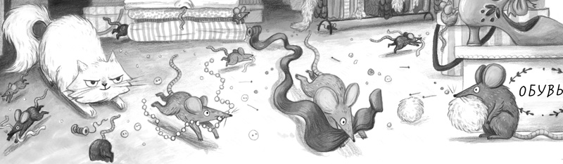 Мышь увидела кота, застыла, а потом начала пятиться к обувной коробке. Максимилиан пригнулся, собрался с силами и прыгнул. Коробка заскользила по полу, и мыши кинулись кто куда. Они взбирались на вешалки, которые скользили под ними, забрались на стол и устроили переполох: рассыпали иголки с булавками и уронили на пол катушки ниток. Одна мышка запрыгнула на зеркальное платье, и теперь невозможно было понять, где зверьки, а где их отражения. Максимилиан кидался то в одну сторону, то в другую, потом вверх, потом вниз, снова и снова, пока не удостоверился, что все мыши покинули комнату, хоть и пищали в негодовании.