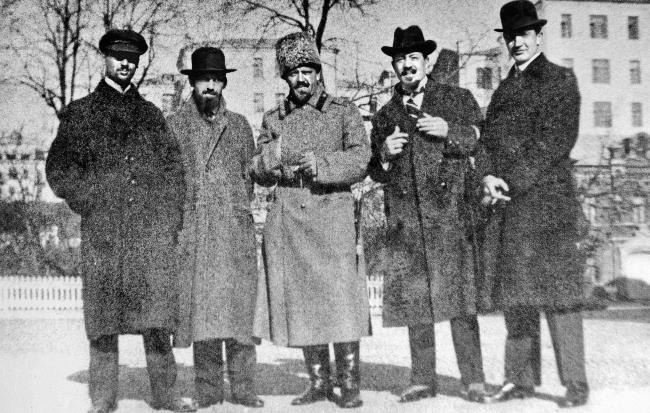 Участники общества художников «Бубновый валет». Слева направо: Роберт Фальк, Александр Куприн, Петр Кончаловский, Василий Рождественский, неизвестный. Москва. 1914