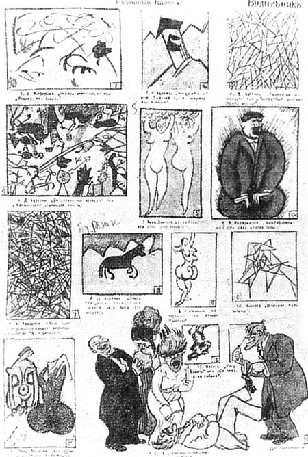 В соревновании за оригинальность Малевич на этой выставке проиграл Татлину, хотя его выступление тоже было неожиданным: свои произведения в стиле неопримитивизма и алогизма он снабдил надписью: «Содержание работ автору неизвестно».