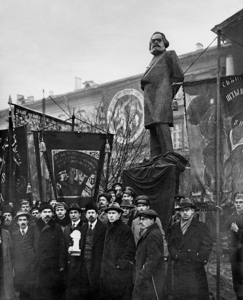 Открытие памятника Карлу Марксу работы Александра Матвеева (стоит справа в профиль). Среди других слева направо: Давид Штеренберг, Николай Пунин, Анатолий Луначарский. Петроград.