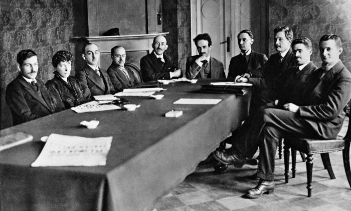 Заседание петроградской коллегии Изо НКП под председательством Давида Штеренберга (сидит в центре).