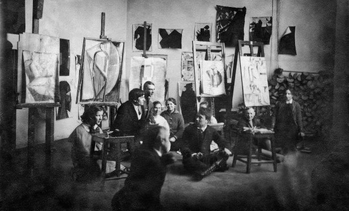 Одна из мастерских Живописного отделения Свомаса. В центре слева направо сидят Казимир Малевич, Павел Мансуров, Петр Митурич, справа – Нина Коган. Петроград. 1918-1919