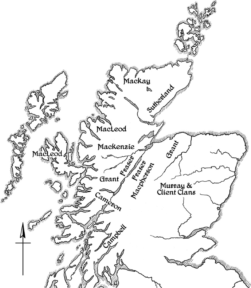 A clan was divided into branches. At the top was the chiefly family, and the families of his close cousins. Each branch was headed by a laird called after his small estate – such as Fraser of Foyers, Fraser of Gorthleck, Fraser of Castleleathers – and held by tack (lease) or wadset (mortgage). He might be responsible for up to 300 ordinary kinsmen and existed in a state of genteel financial stress. The minor lairds, who managed the Highland parts of the estates, could not make ends meet without the financial support that service to their chief earned them. As a consequence, upcountry men were more old-fashioned than their low-country brethren. Unlike English landowners, clan chiefs such as Lord Lovat kept large bodies of armed men in a state of semi-militarised readiness to protect the clan, and travelled nowhere without a ‘tail’ of up to a hundred of well-accoutred followers on horse and foot. The hill lairds were the first to make up Lord Lovat’s ‘tail’. He loved them above all his clansmen.