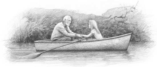 GRANDAD DRAWS THE OARS INTO THE BOAT as we coast on the glassy water until we nudge into the bank. We both have our fingers over our lips, not to tell each other to be quiet, because we are, but because we think alike. I don’t know what Grandad has seen, I only know to trust him.