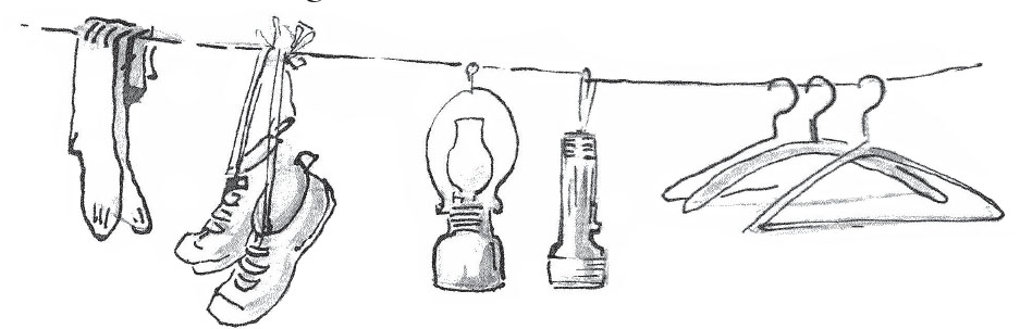 To help feel more at home, Tiger unpacked her case in the tent. Colourful striped rugs from Africa covered the ground and the tent smelled of dried grasses and faraway. There were two camp beds, puffy with sleeping bags and blankets, and Tiger put her pyjamas under the pillow of the one where she’d sleep. A rope was strung from one end of the tent to the other, hung with gas lamps for night-time, coat hangers for clothes, a torch for visiting the outdoor bathroom, and a pair of May Days’ shoes tied by the laces.