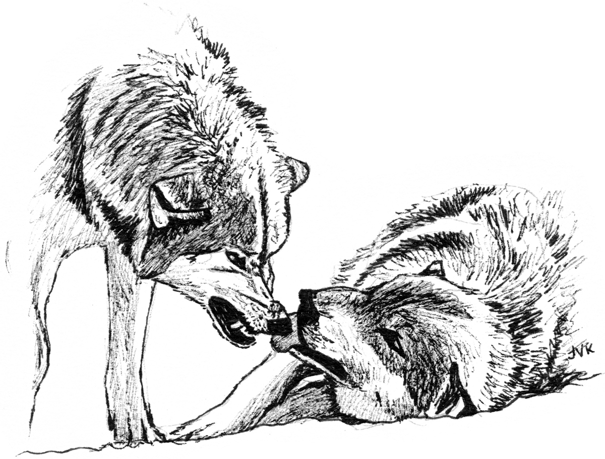 Even the idea of submission has been woefully misinterpreted. Wolves living a free and wild existence don’t exert dominance over each other in order to elicit submission; on the contrary, submission is offered freely by one wolf to another in order to gain reassurance – something quite different – and it’s a behaviour that’s not shared by their domestic cousins, the dog. Indeed, wolf cubs raised with domestic dogs sometimes illustrate this in the oddest ways, with the cubs trying to push their muzzles inside the jaws of their rather bemused domestic dog elders.