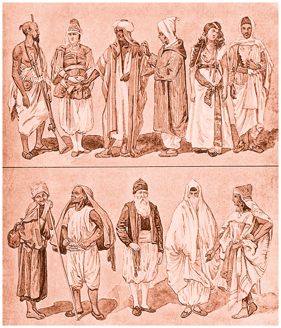 Народные костюмы Марокко, Алжира и Туниса. Иллюстрация из книги А. Розенберга и Э. Хейка «История костюма», 1905 г.