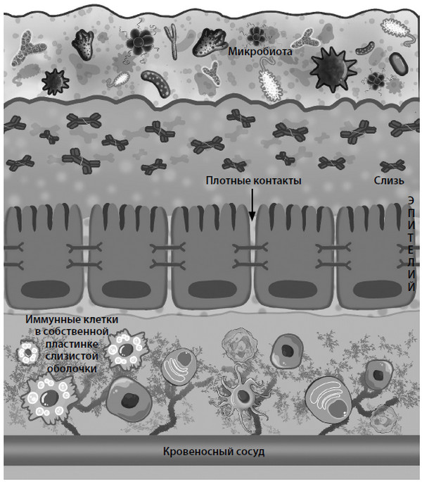 Можно сказать, что этот слой похож на землю за стенами, на которой живут наемники. Если по какой-либо причине они останутся без земли, они разозлятся и захотят войти в город. В таком случае они перестанут выполнять свои разведывательные задачи и ничего хорошего из того, что привезут крестьяне, не приготовят. Может, разве что будут делать самогон путем ферментации фруктов и зерна, вызывая при этом много токсичных паров. То же самое происходит, когда в нашей микробиоте наблюдается дисбиоз – пища чрезмерно ферментируется, вызывая образование газов и веществ, повреждающих кишечный барьер. Слизь очень важна. Я помню пациента, который однажды сказал мне, что хотел бы сесть на несколько экстремальную диету, называемую бесслизистой, потому что думал, что слизь – это плохо. Конечно, выделять литры слизи с фекалиями нехорошо, но она нужна нам, чтобы жить. Без нее наши барьеры – ничто, и микробиота становится несбалансированной.
