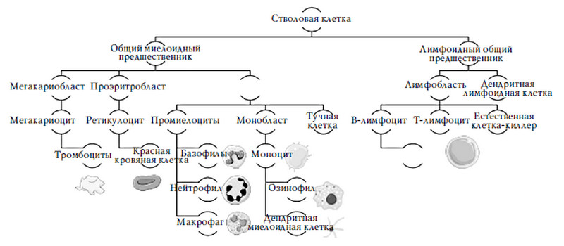 Рисунок 8. Кроветворение. Включены не все промежуточные типы клеток. Источник: изображения с сайта ServierMedicalArt. https://smart.servier.com. CC BY 3.0.