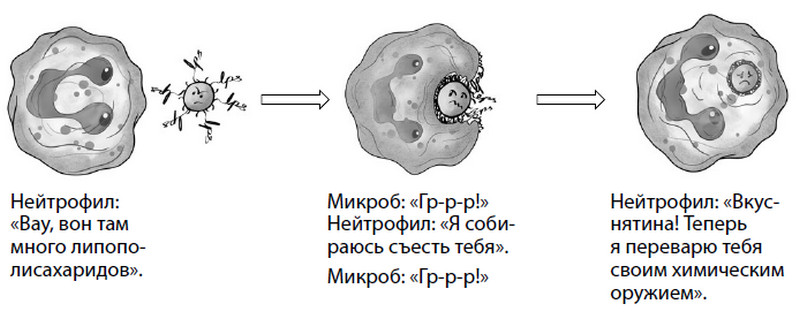 Но чем? Ну, обычно это различные микробы, особенно бактерии и грибки. Нейтрофил окружает их псевдоподиями, проталкивает внутрь и захватывает куском мембраны.