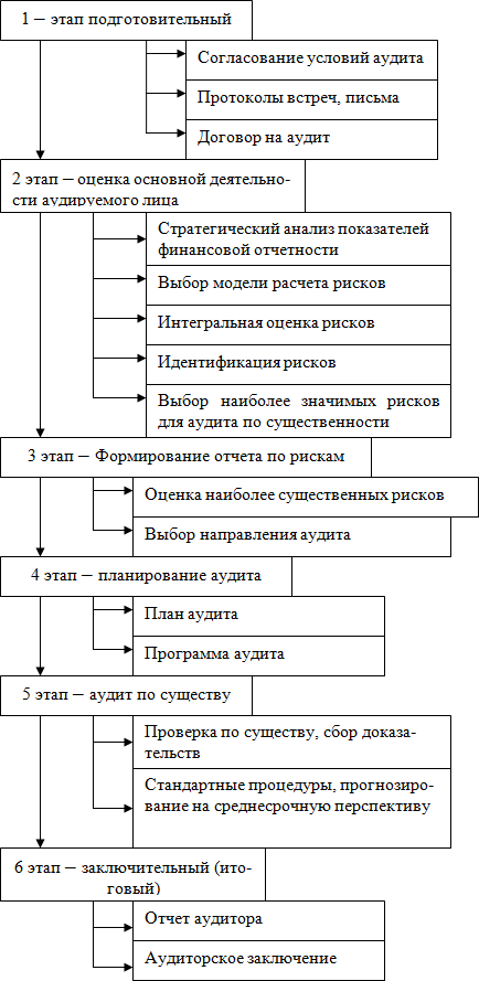 Процесс проведения аудиторской проверки можно разбить на несколько взаимосвязанных действий. С применением международных стандартов аудита проведение аудита в настоящее время приобретает новый вид. Модель риск-ориентированного аудита включающая шесть этапов проведение проверки приведена на рисунке 2.2.