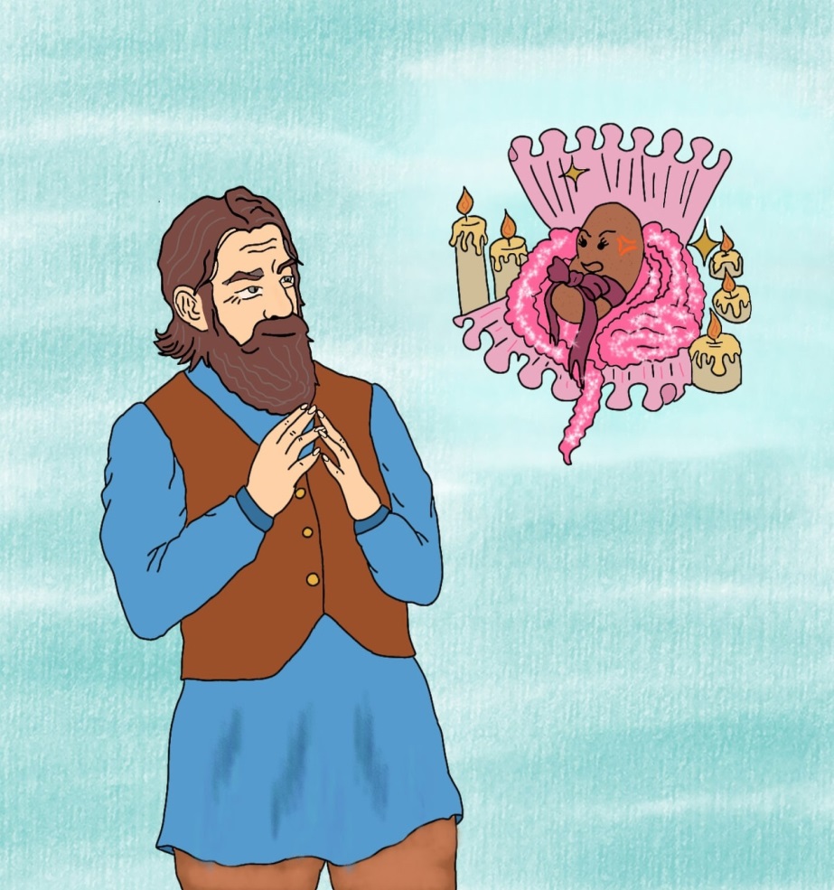 Его статная высокая фигура грозно возвышалась над трепещущими жителями. Всякий тут пытался прикоснуться к принцессе, потрогать её пальцем, а тому, кто безнаказанно подходил ближе и рвано дышал на картошку, по возвращении в душную толпу приносили почести за смелость. Купец, которому надоели ахи-охи мужчин и женщин, прикрикнул на них и, ударив пару раз кулаком по хлипкой стене, принялся ждать тишины. Деревенские побормотали что-то отдалённо похожее на восхищение вперемешку с ругательствами и смолкли. Купец, расчесав свою бороду пальцами грубой руки, обратился к толпе: