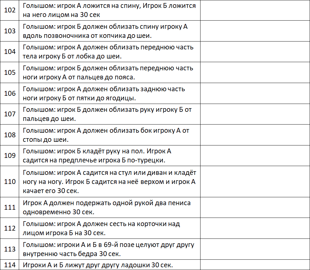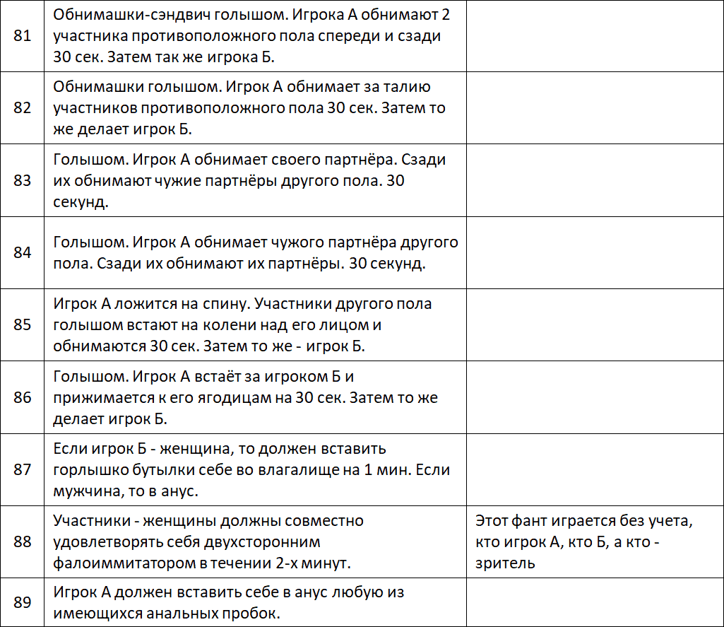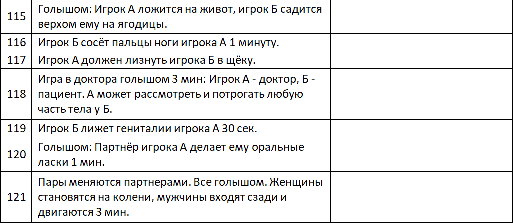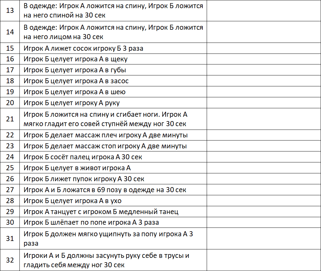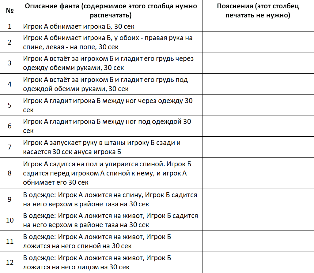 • Даже если у супругов не нашлось таких фантазий, которые хотелось бы реализовать обоим, это далеко не тупик. Часто наши представления сильно отличаются от тех впечатлений, которые приносит реальный опыт. Полезно попробовать различные действия, которые находятся на границе допустимого, даже если эти действия не являются желаемой конечной точкой. Возможно, после этого ваши границы допустимого расширятся и ранее недоступные действия окажутся внутри этих границ.
